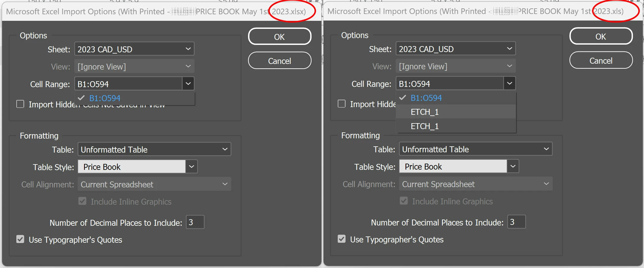 I've seen similar issue report for Indesign 2020. I'm trying to link an excel table (xlsx) and have named a cell range in excel. When I try and Place the excel spreadsheet and use the option to select cell range my defined cell range in excel does not show in the dropdown.