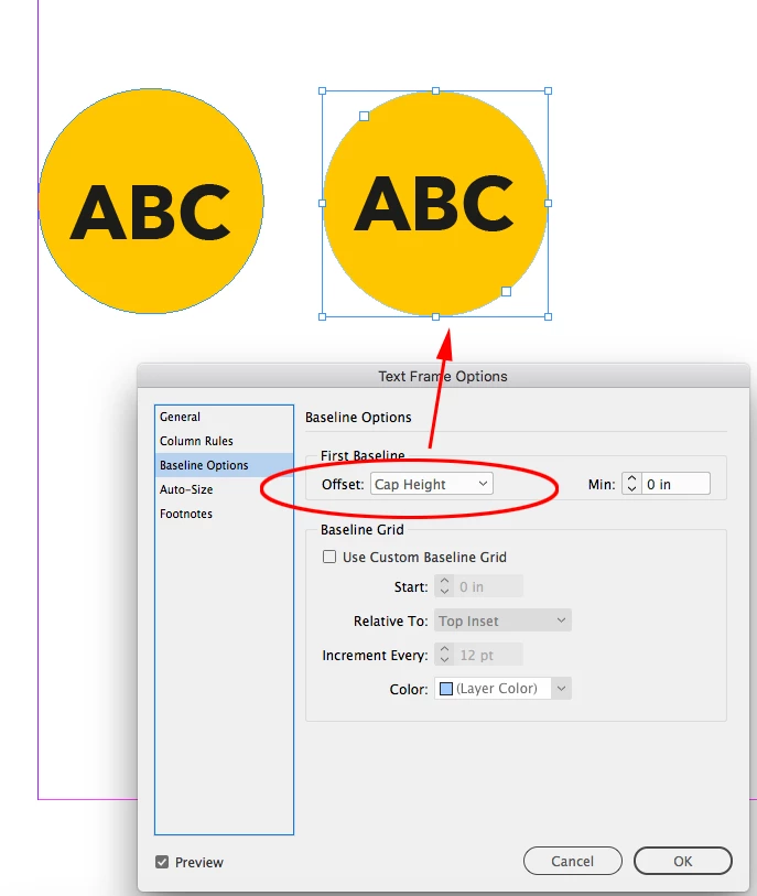 Mike, I share your frustration, and I don't have any good workarounds to the issue other than experimenting with the various baseline options for the frame and baseline shifts for the text. And then in total frustration, just creating two elements, the text and the circle.