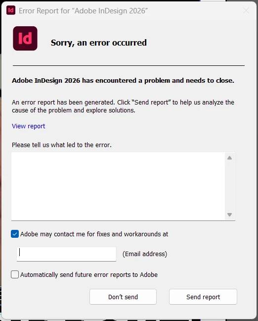 My software recently updated to Adobe InDesign 2026 on Windows 11. Whenever I try opening an InDesign document now, I receive a dialog box with the error message "Adobe InDesign 2026 has encountered a problem and needs to close." The program then closes.