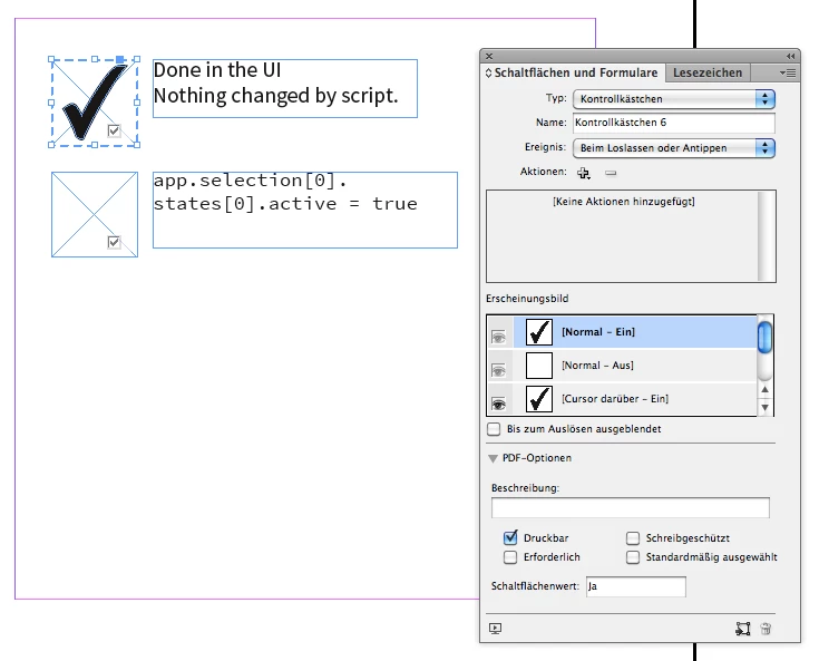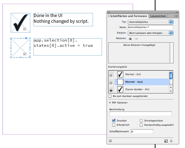 I'm using indesign cs6. I want change the checkBox states of Normal On to Normal Off state using indesign scripting. I'm trying more but i can't find it. Pls guide me.