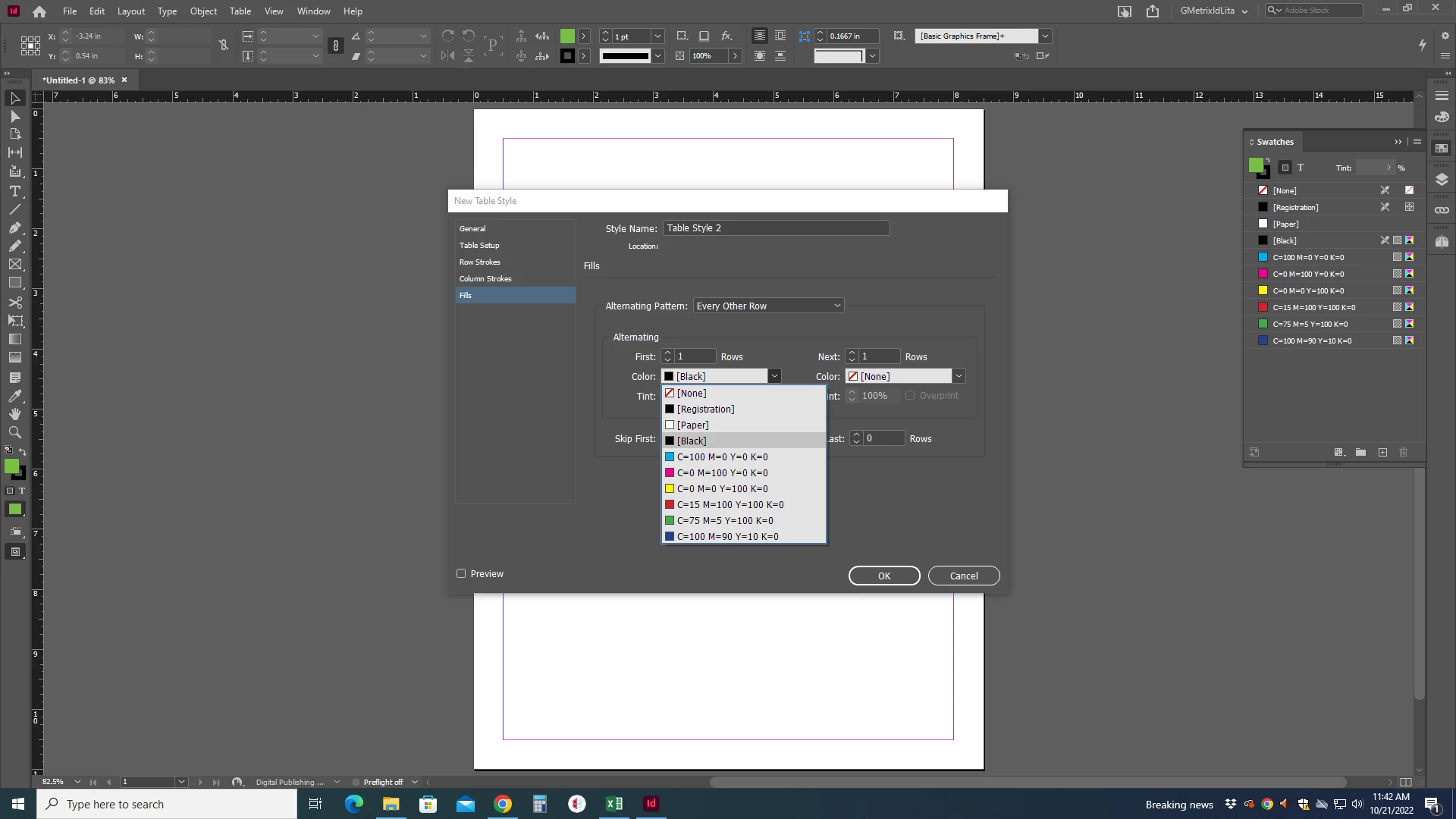 How can I change from RGB to CMYK colors for alternating row fill colors in a table? Using Window/Color does not work.