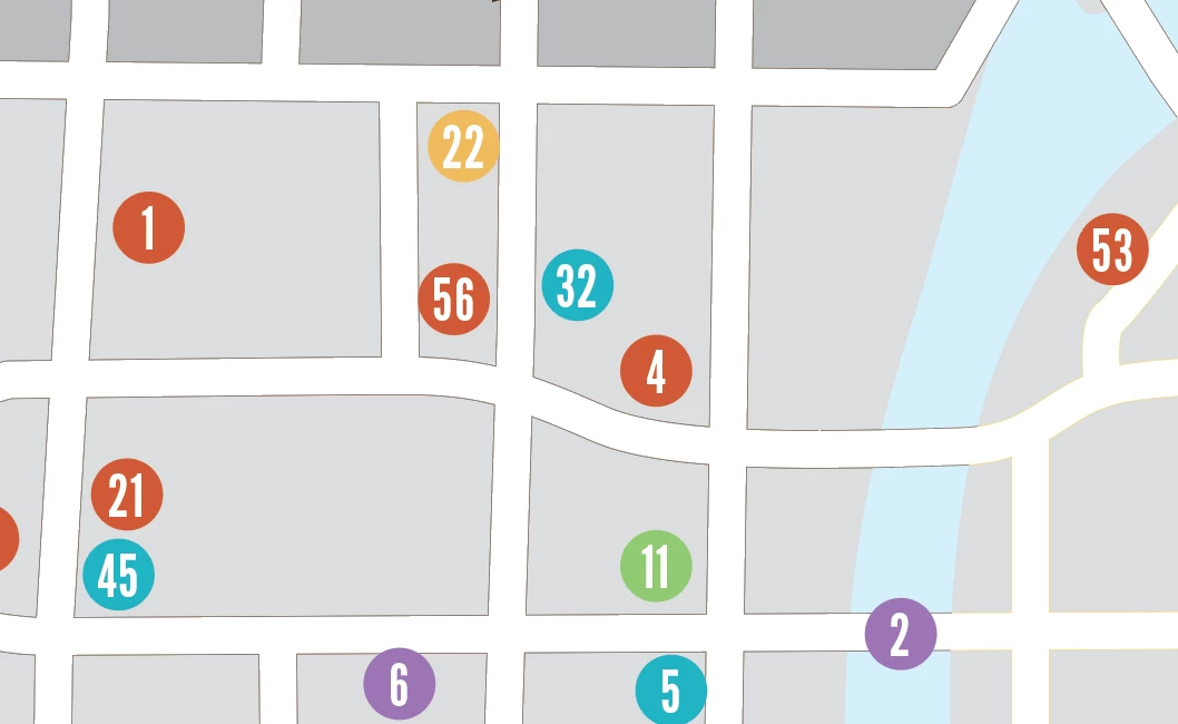 The numbers in the dots relate to an alphabetized list of buildings on the map.