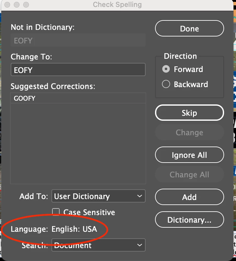 This WILL NOT change any existing document. For those, you will have to edit the Paragraph Styles assigned to the text you are trying to spell check. If your Style is based on another one, you should go back to the root style and change it there. Go through your entire list of Paragraph Styles to check.