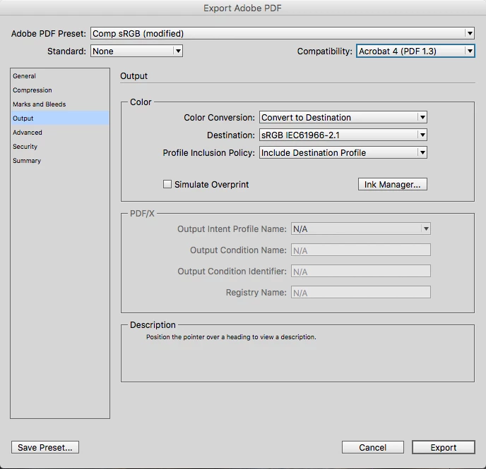 Also, even if you go to the trouble of converting every object and color in your document to RGB (which really isn't necessary), you still have to use the correct setting in the PDF Export Output tab. The warning you are getting indicates that you have the Destination set to a CMYK profile, which conflicts with your RGB Transparency Blend Space.