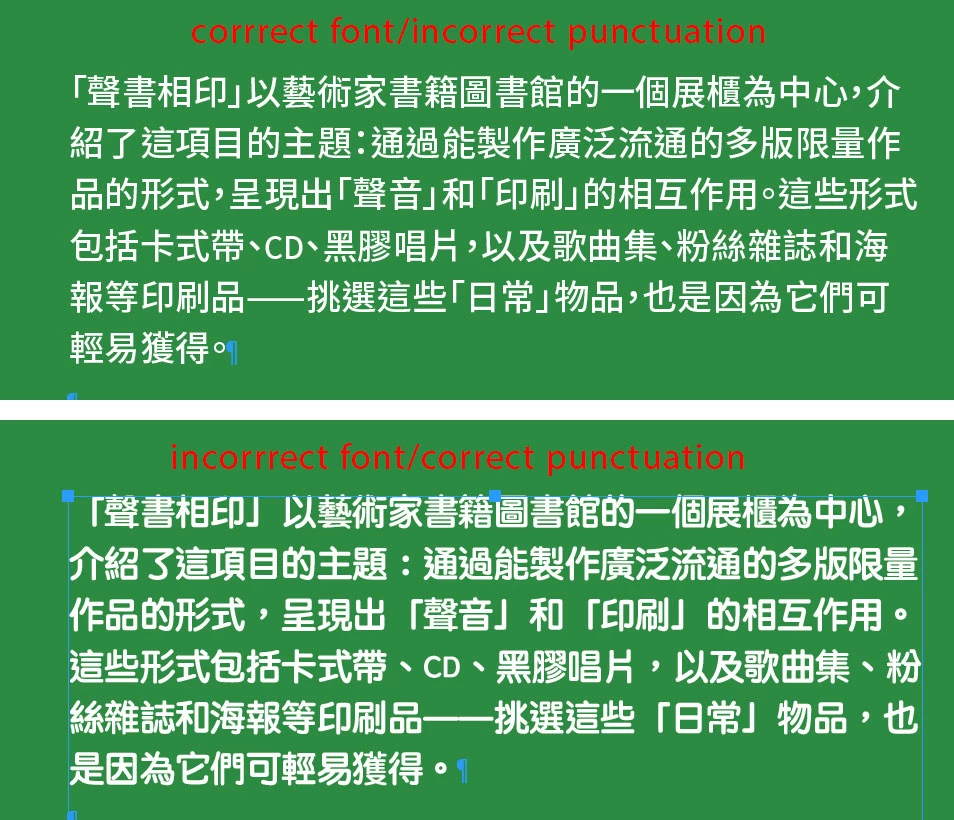 Hello, I'm laying out a bilingual, Traditional Chinese + English document. I'm using the client's house font, Noto Sans TC. For some reason my Indesign is using half-width characters for all the punctuation in the Chinese text, which is messing up their line-breaks and layout. The font definitely includes full-width punctuation (because they have used it on other documents), and chaning to another Chinese font displays the same punctuation correctly as full-width, but not the font I need to use. Can anyone advise on what might be causing this problem? Thank you so much!