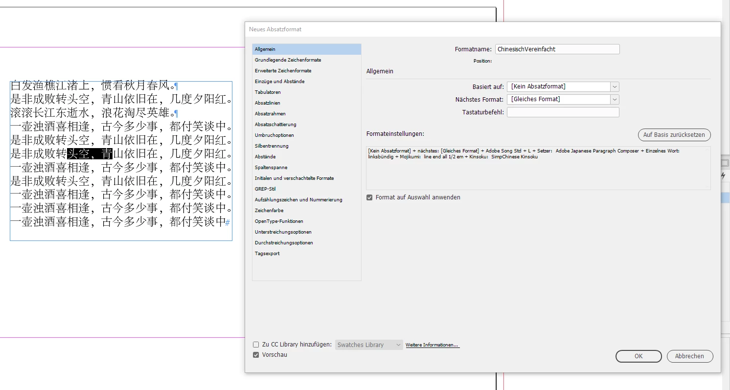um an chinesischen Text heranzukommen, kannst Du zunächst einmal chinesischen Blindtext ( Platzhaltertext ) erzeugen und aus diesem Text ein Absatzformat erzeugen. Dadurch erhälst Du den Chinesischen Japanischen Absatzsetzer*, der sonst nicht direkt in einem deutschen InDesign verfügbar ist ( ab InDesign CS6 ).