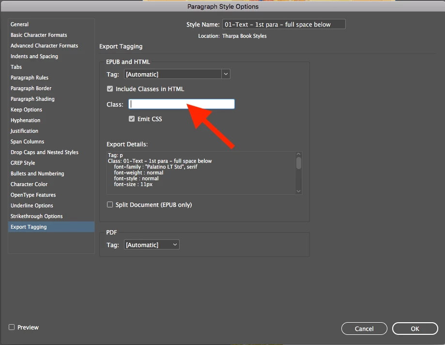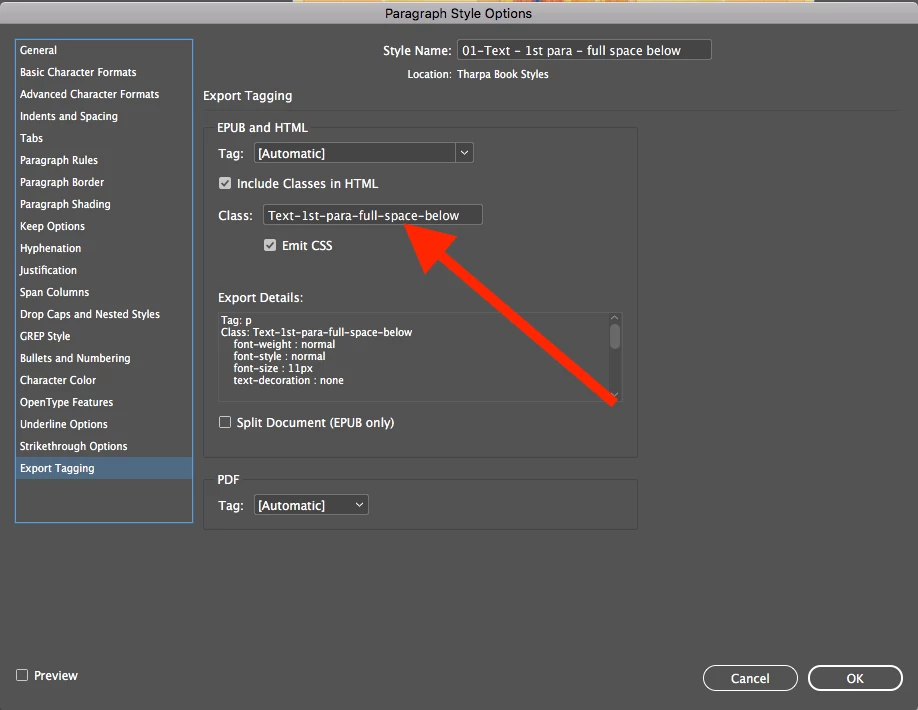 Clean Export Tagging Class in Paragrah Style Options