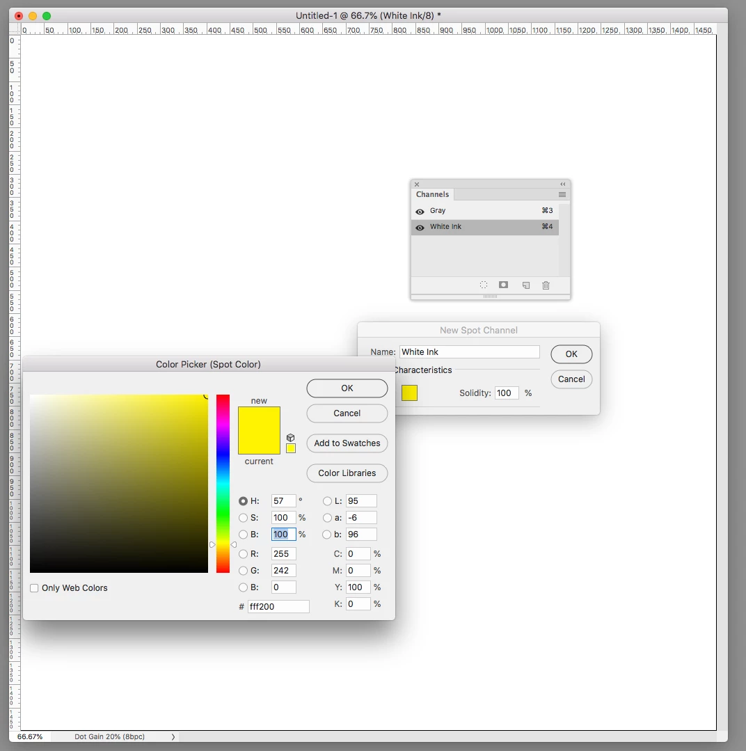 I am designing a card but i need to add a spot colour to print white. The colour i need to use is 100% yellow. I design the card in photoshop and give the objects the colour 100% y. Than i open the file in InDesign but the colour is different as the 100%y in InDesign.