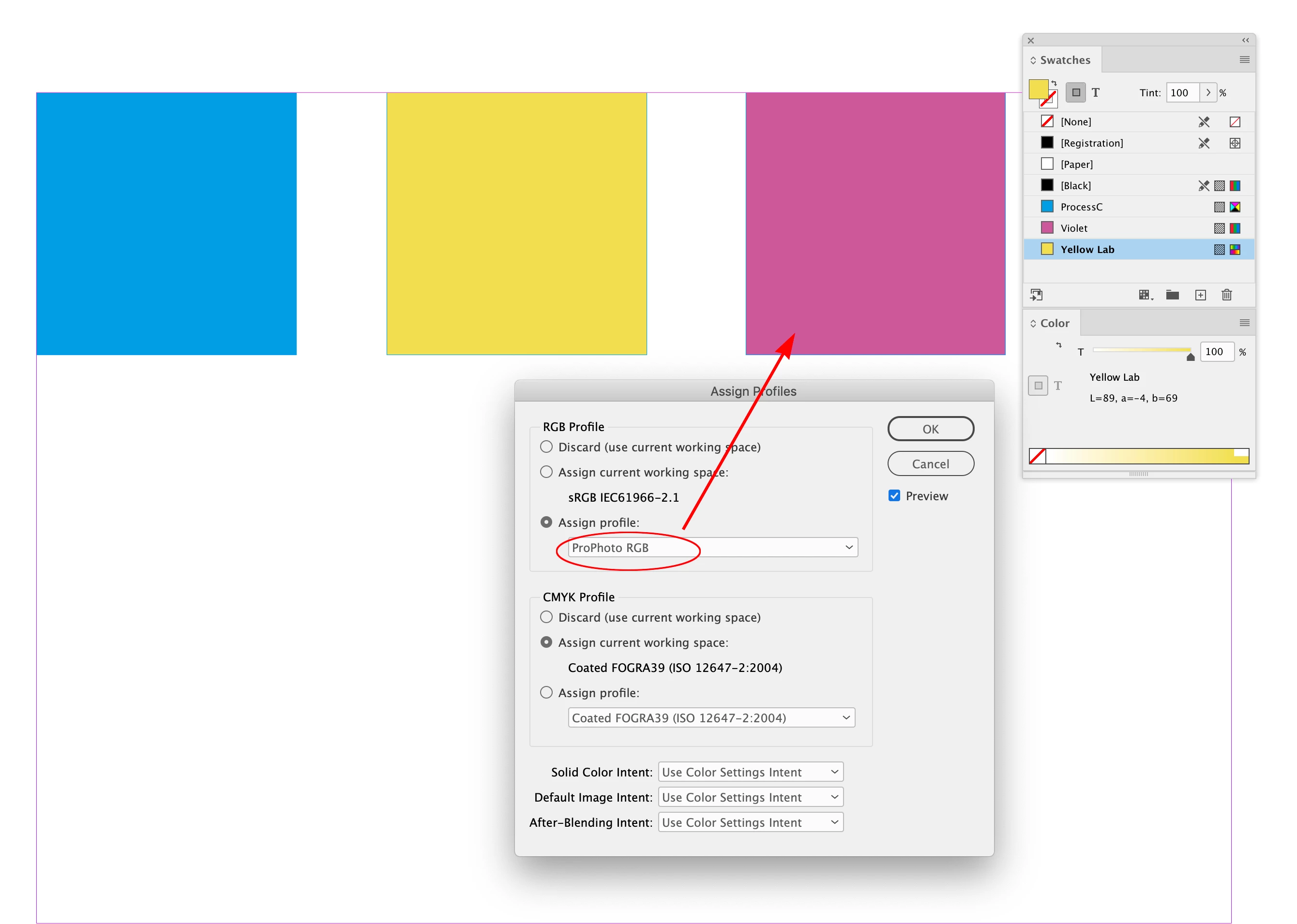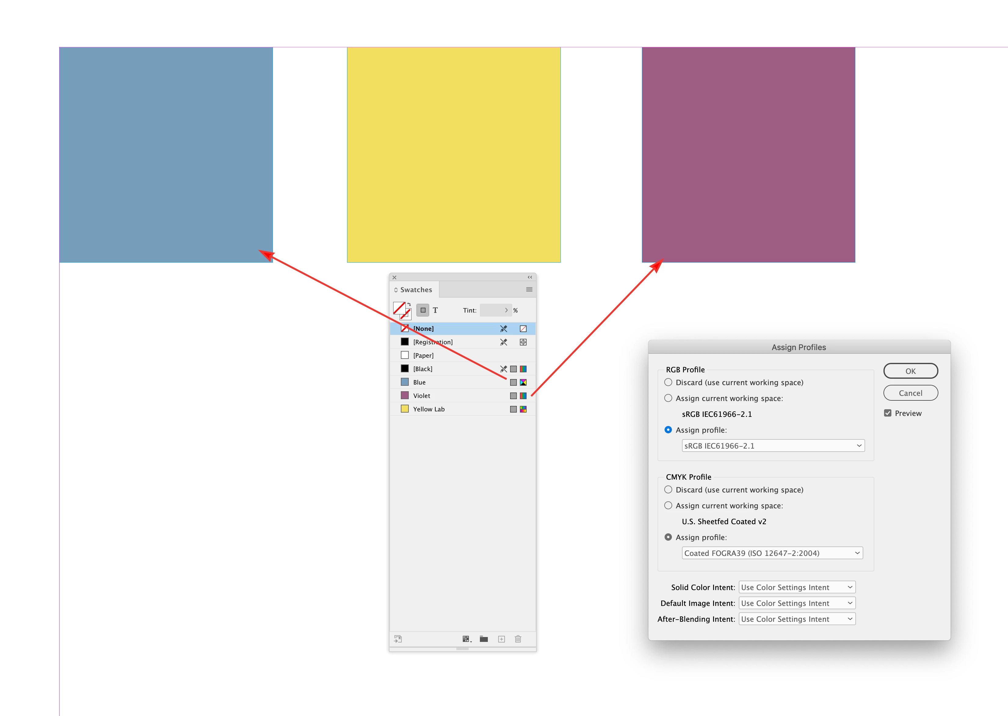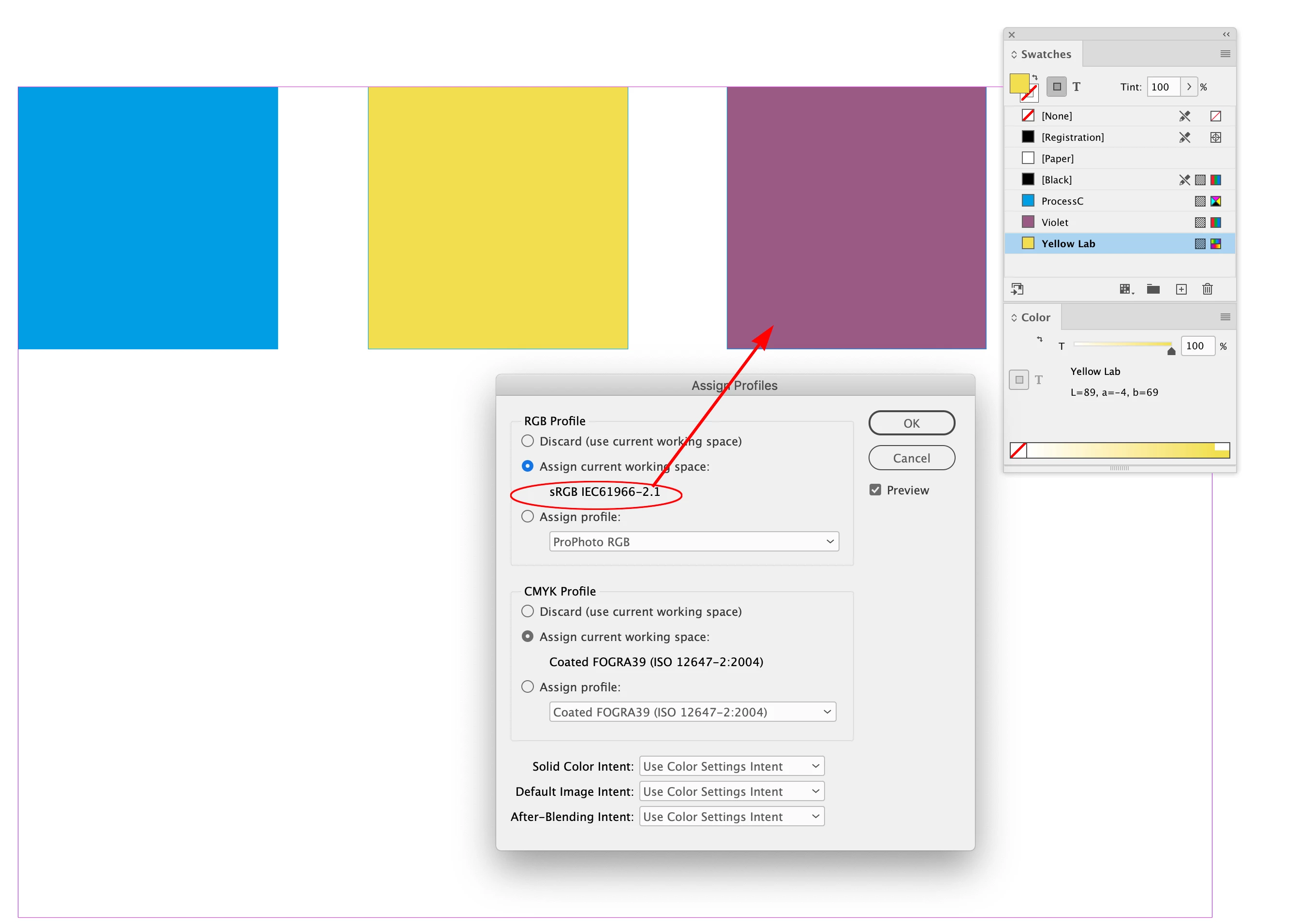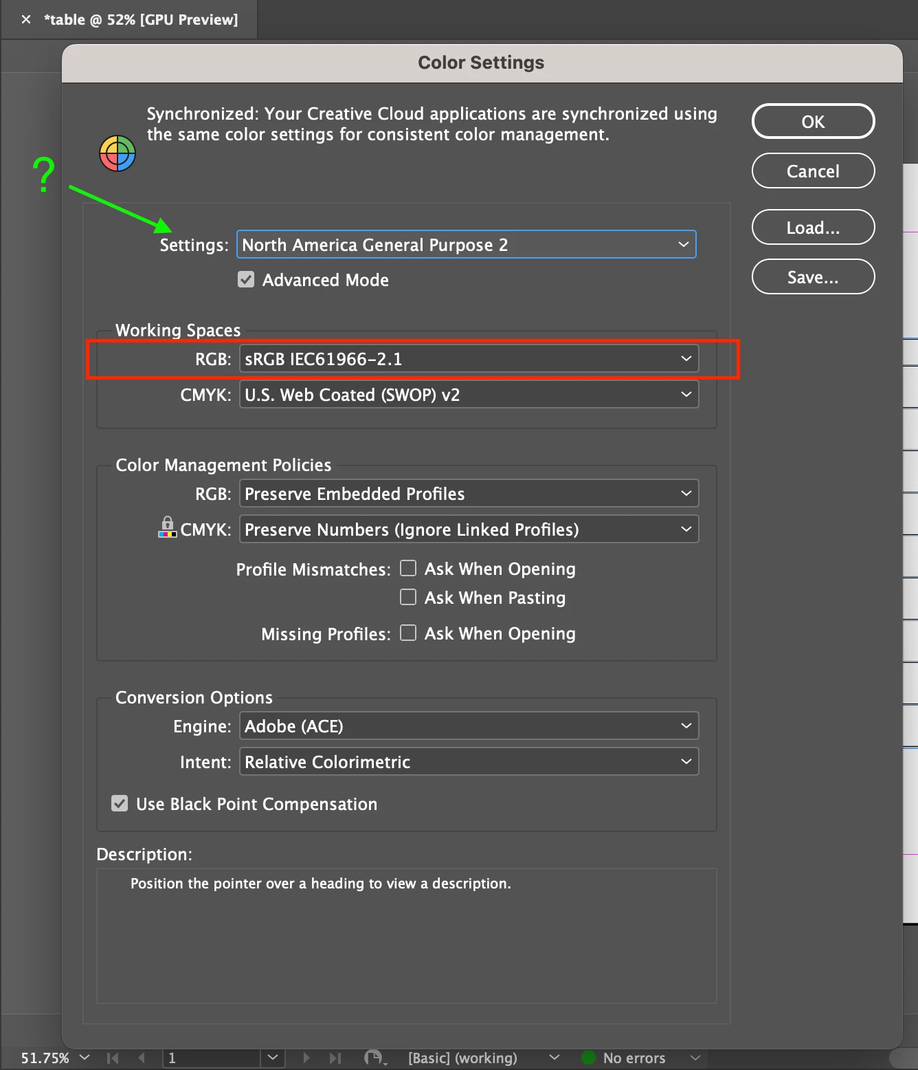 In Adobe Illustrator, I can set color more (RGB) and color profile (sRGB) from creating a new document.