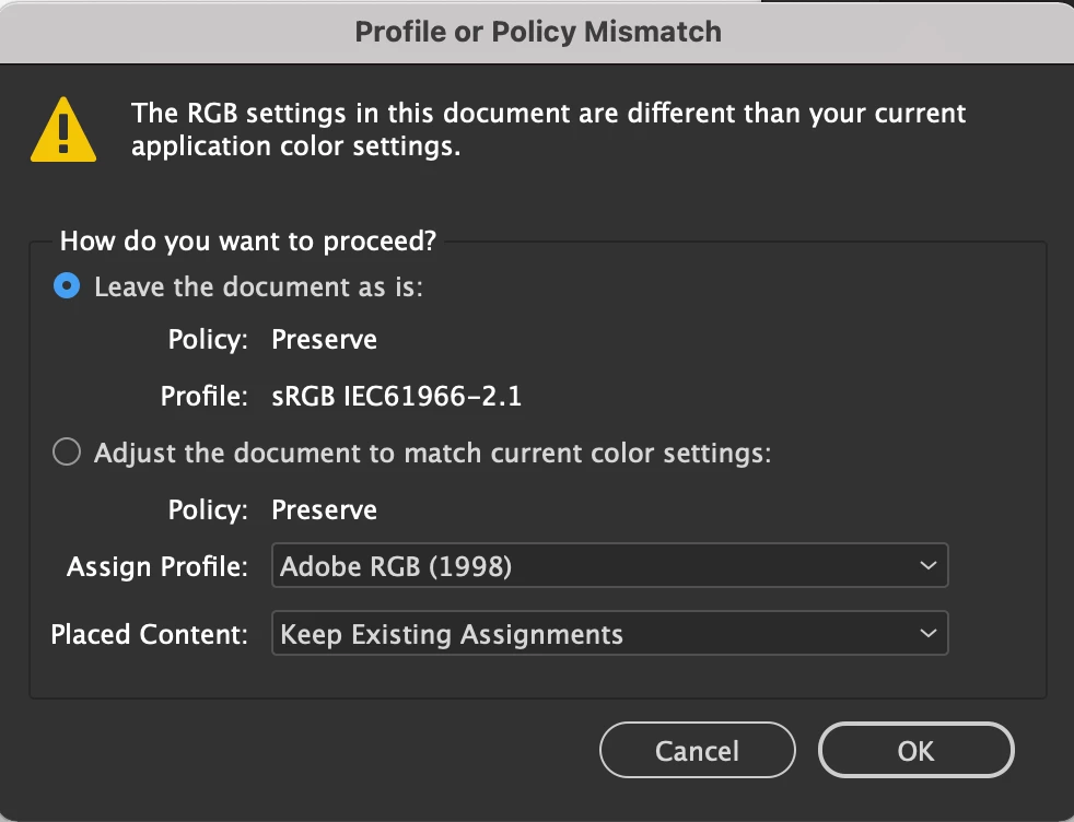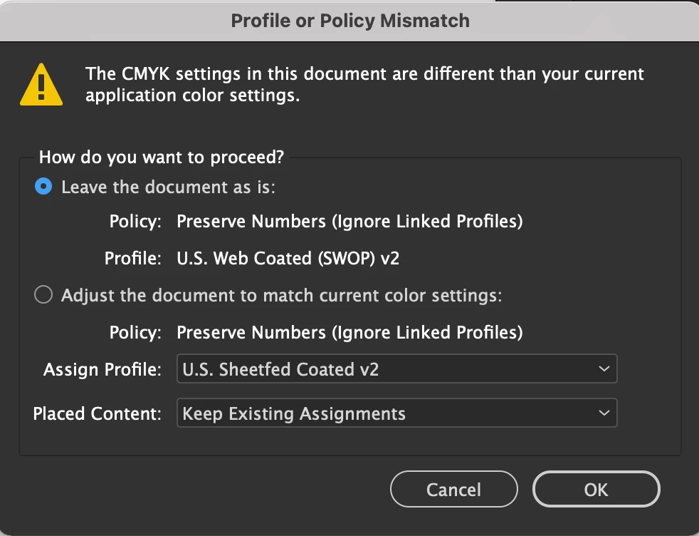 Color settings in InDesign (profile or policy mismatch) - help!