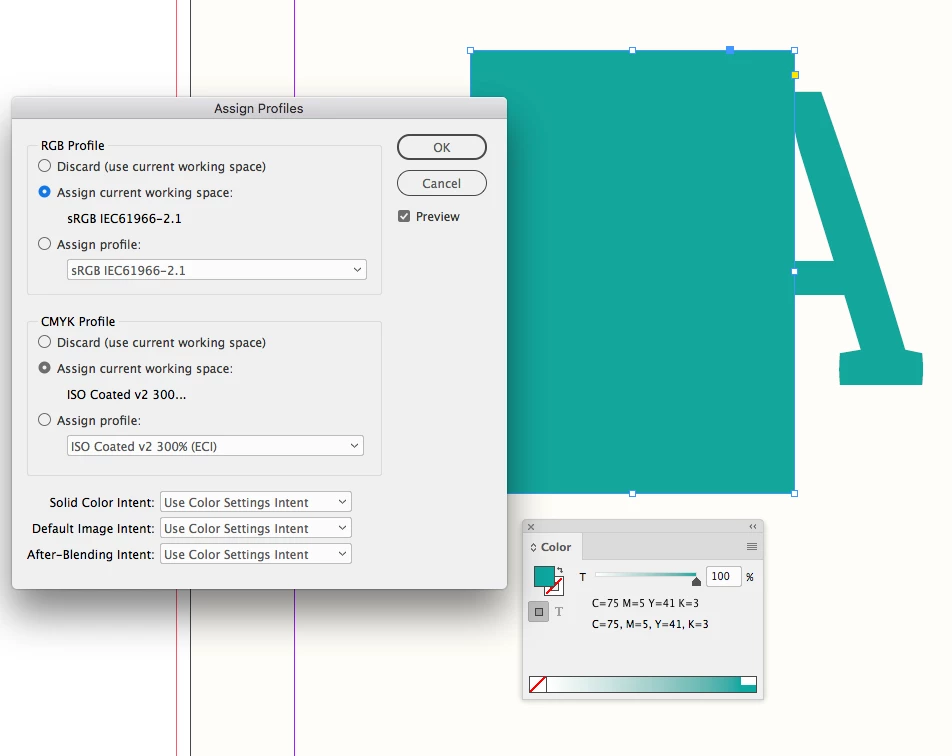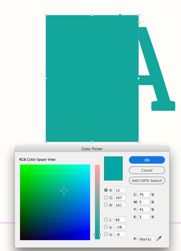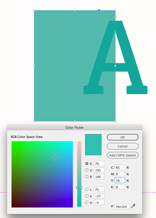 1. Create an Illustrator file and create an object with specific CMYK colour fill of (73,5,41,3). (It shows hex value 4bc1b4 in the colour picker), and save it.