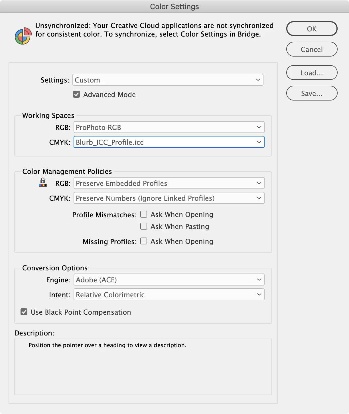 So, with this Color Settings any new ID documents would get ProPhoto assigned as the RGB space and Blurb_ICC_Profile as the CMYK space. Placed RGB images would have their embedded profiles preserved, and placed CMYK images would have their embedded profiles ignored (the Preserve Numbers (Ignore Linked Profiles) CMYK Policy). This setting would not necessarily have any affect on an existing doc, which normally would be saved with its own profiles and policies: