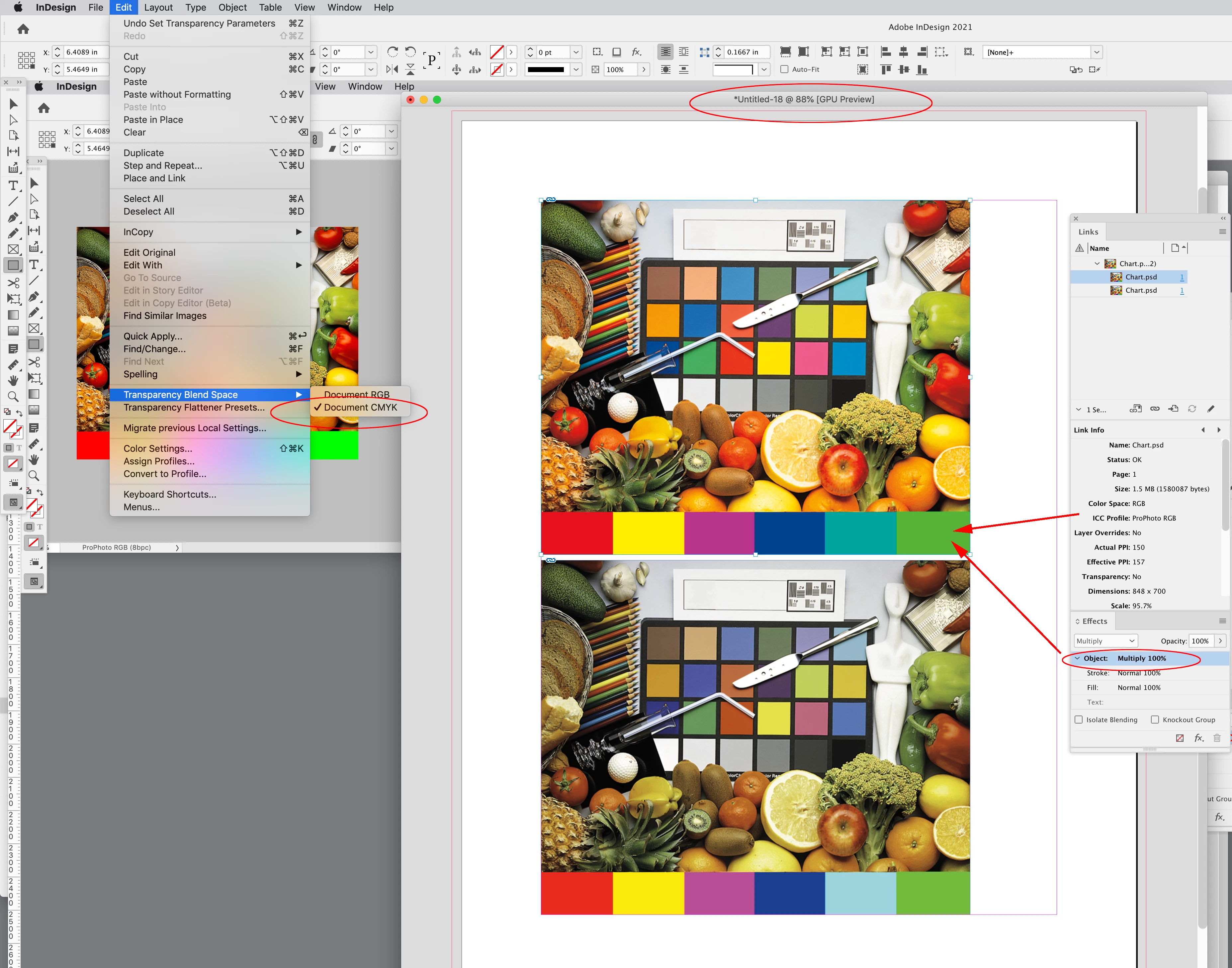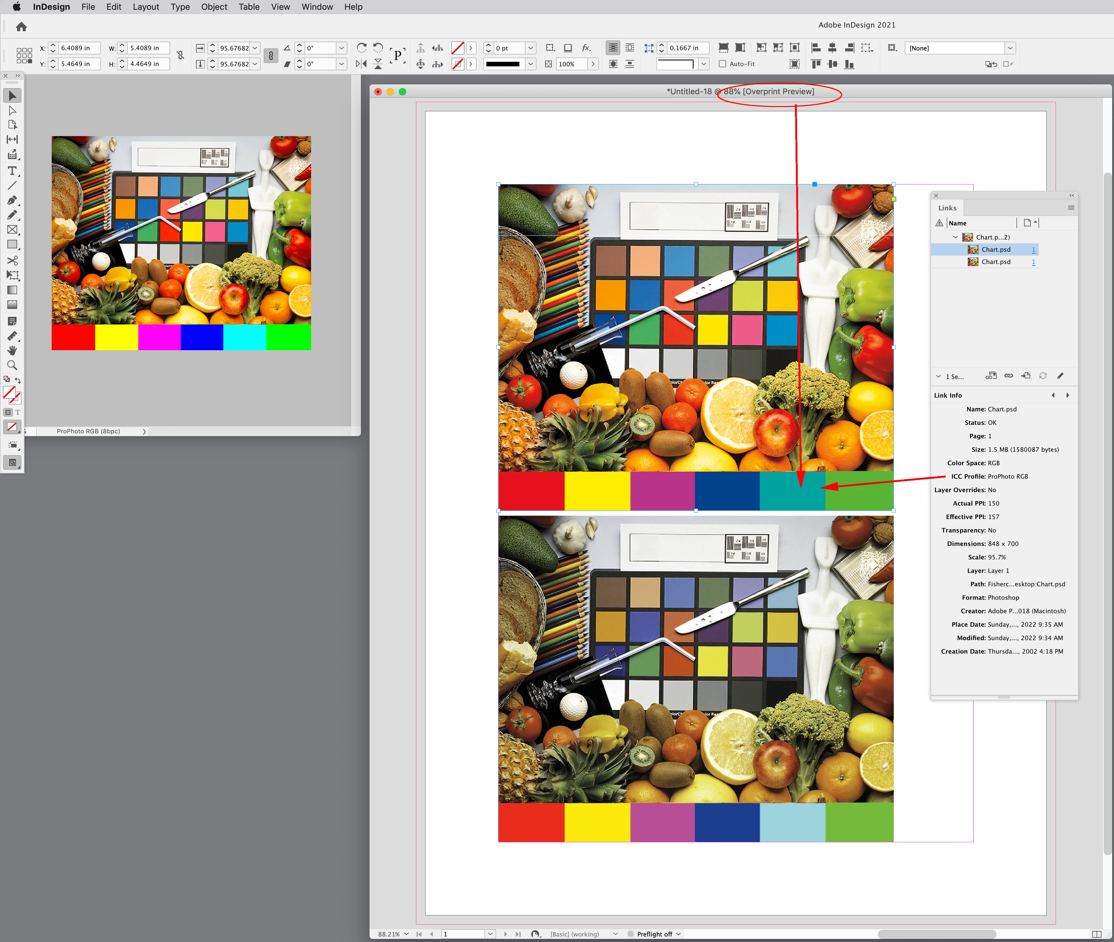 Also, if there is any transparency on the spread, including a Photoshop file without a flattened Background layer, the spread is previewed in the Document’s Transparency Blend Space. When a spread is flattened for output the color space has to be uniform in order to blend the transparency effects.
