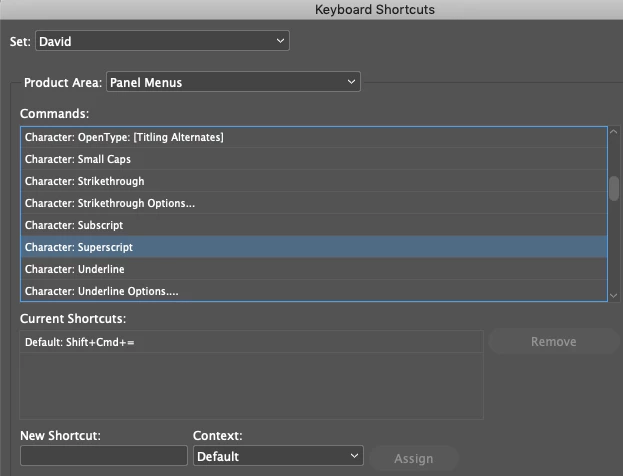 Command + Shift + = Should Set Text as Superscript in InDesign