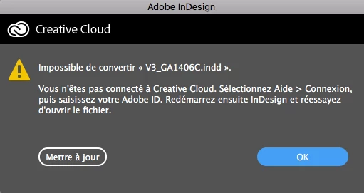 Je n'arrive pas à convertir un fichier InDesign pourtant je suis bien connecté à mon Compte Creative Cloud (via le navigateur ET AUSSI via l'application bureau Creative Cloud). J'ai beau me déconnecter et me reconnecter changer mon mot de passe etc..., rien n'y fait.