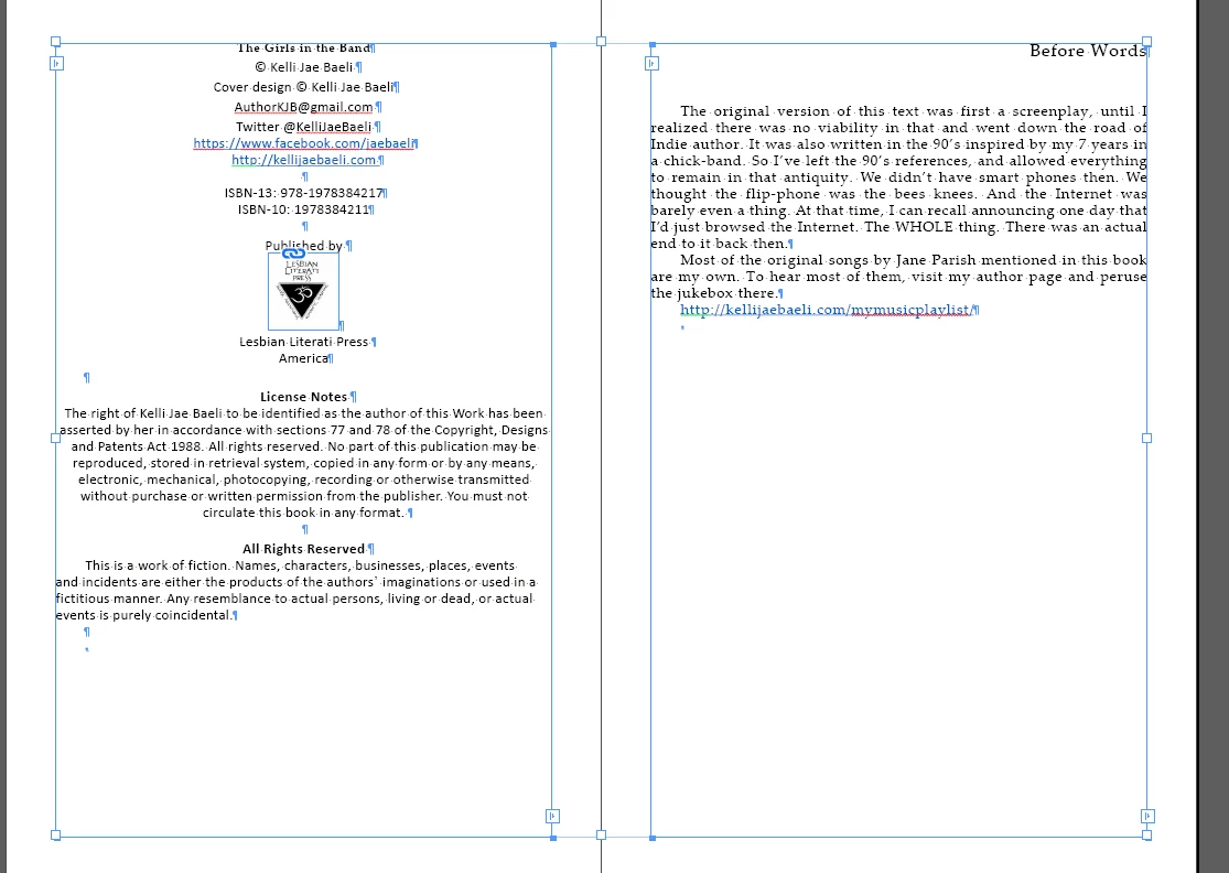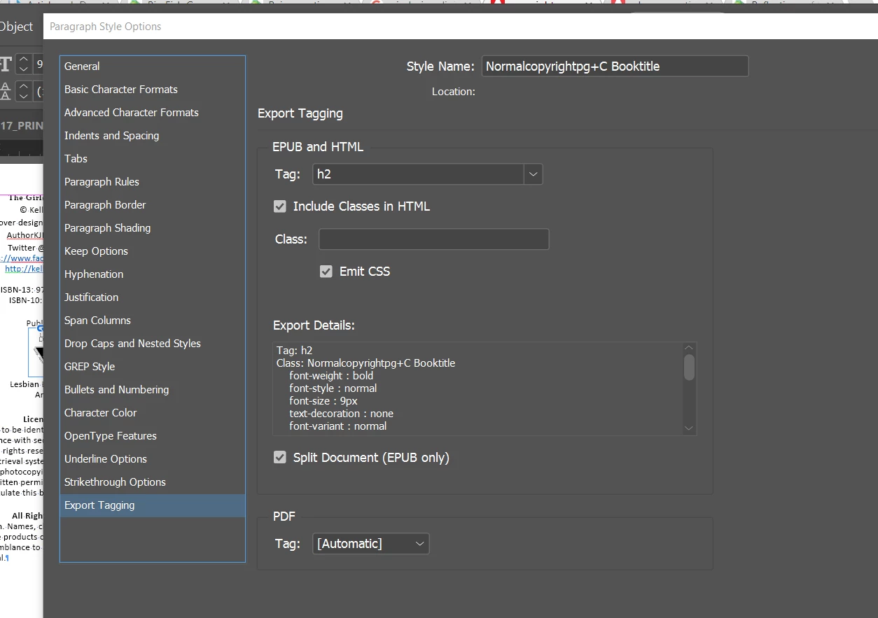 What i was doing before this happened: the tiny symbol (c) at the top had a style applied to it, (so that i could get that page to start on a separate page, in other version) and i decided to get rid of the symbol graphic and just use some kind of text there. I applied the new style, which was the same as all my other chapter headings that break to the next page just fine, and since i did that, the copyright page does not show up AT ALL in the epub file. It's just gone. I did this again, checking all the settings, and the same thing happened. Anyone know how this could happen? Below are the screenshots of my settings.