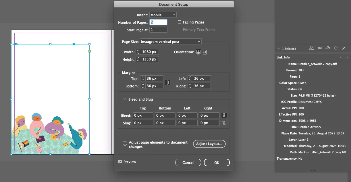 I am working on some Instagram posts and trying to add a pre-made image, but although my document is set up as 1080x1350 and the image is 3508x4961, the image still looks tiny. Is there a way to change my document's PPI? or does anyone know what the problem is? Pleeeaaase I do not want to re-draw my illustration.