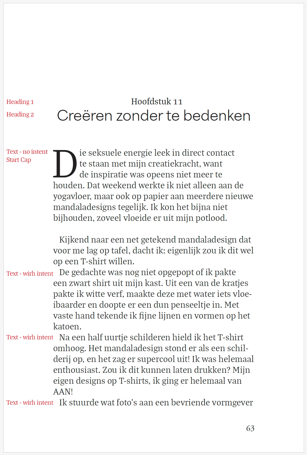 Ik helping out to create a novel. But I am struggling with indent on the next paragraph. I tried the "next style" option What only will work if I do live typing. So after a Return (^p) it automatically will create the next paragraph style. But it is not working when importing a docx, RFT of other file.