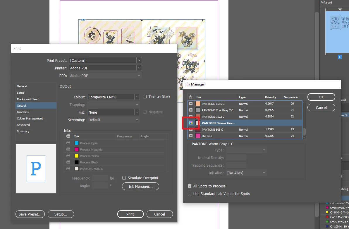 I have a 16 page InDesign file that contains hundreds of imported Illustrator images that were created using spot colors. Each image will be die cut, so I also have a layer in the InDesign file with the die lines created using a spot color set to overprint.