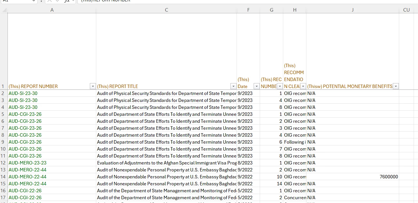 The outcome should be sorted based on the last five characters of the report number (in descending order), and the date (in ascending order). Additionally, the data should be grouped based on the Report Number, Date, and Title. Finally "open Recommendations and Potential Monetary Benefits" as seen in the picture should be repeated on each page. The full file can be found here.