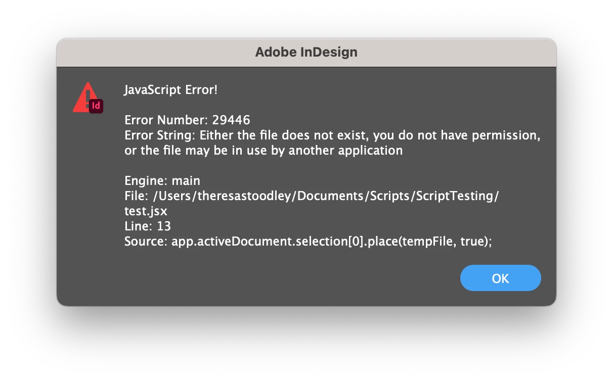 The goal of this sample is to generate a temporary text file and then place it in a text frame. I understand that there are significantly better ways to move a string into a text frame, but I want to understand why this in particular is not working.
