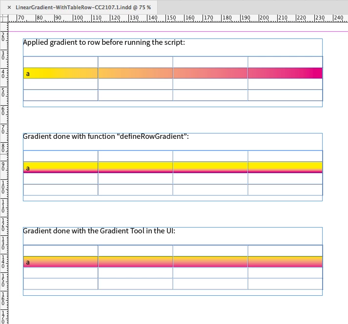 By "almost works" I mean that it works fine on tables that fit in a single frame. It falls apart when the table flows to another frame or another page. The page coordinate calculations seem to hold up, but the gradient isn't applied correctly to each row. The vertical position creeps up or down, or the rows are filled with solid color or left blank. It doesn't seem to matter if the gradient is applied as part of the cell style, or as an override. It seems as if something needs to be reset each time the table jumps to a new frame.