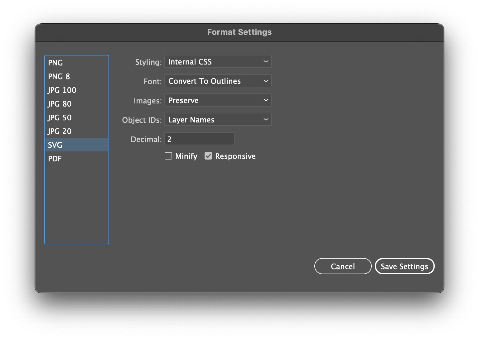 5. Now go to File > Export > Export for Screens, then set it to export all artboards to SVG with these settings (which I think are good because without converting to outlines InDesign will complain about missing fonts)
