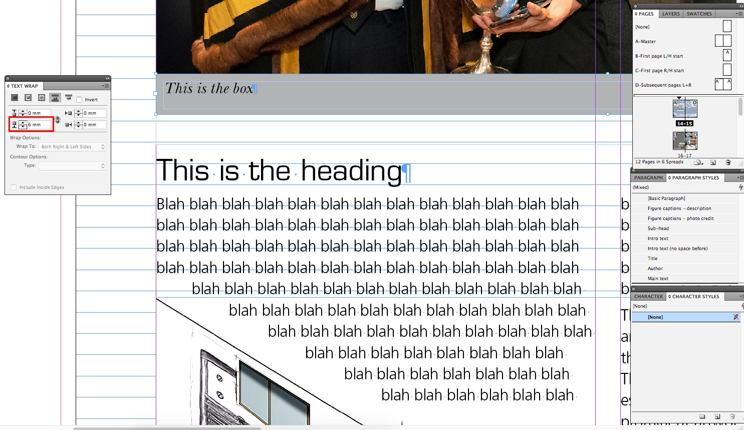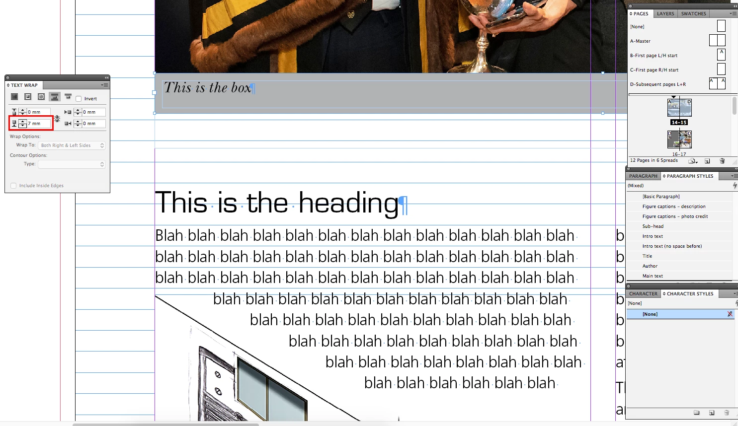 I have a weird problem where I have a heading paragraph following a box (which is not part of the text flow) and I can't get the paragraph any nearer to the box - it's currently >5mm away. The box has no text wrap on the bottom. When I add text wrap to the bottom of the preceding box the paragraph below doesn't move, until I get to a particular amount of text wrap (6mm) and then suddenly the paragraph jumps down. It's like the text has to move down one whole line rather than just however much the text wrap amount is, but the paragraph is not aligned to any grid. Also the text box has no vertical justification - it's set to "Align top". Can anyone suggest what the issue is?