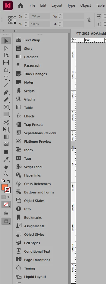 The Tools panel (Window > Tools) is on the far left of all your screenshots. It doesn't change in InDesign, but you can hide/show it using Window > Tools.