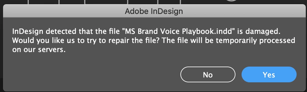 Hi, I have two InDesign files that I'm not able to open. I get the message: "InDesign detected that the file is damaged. Would you like us to try to repair the file? The file will be temporarily processed on our servers."