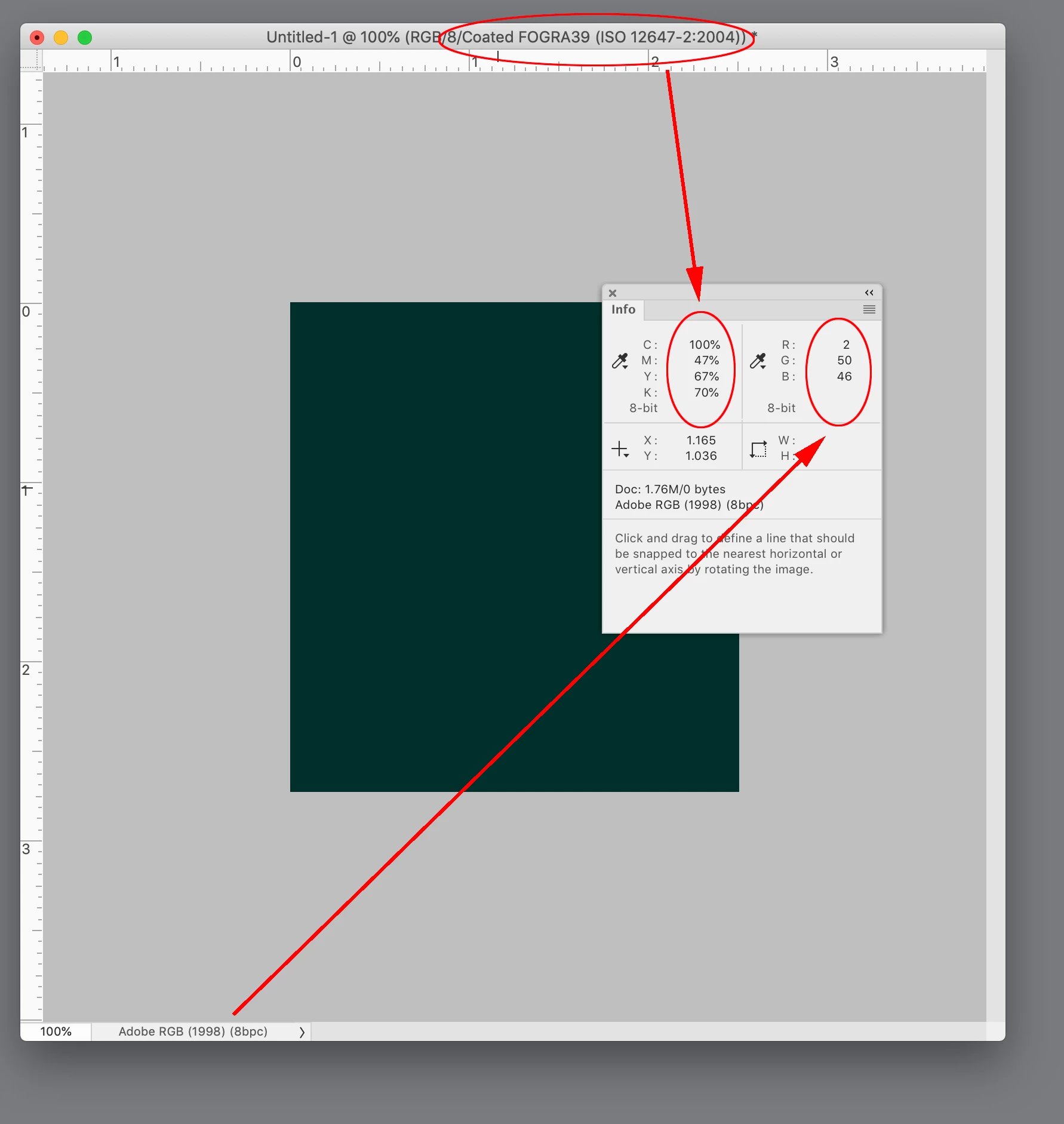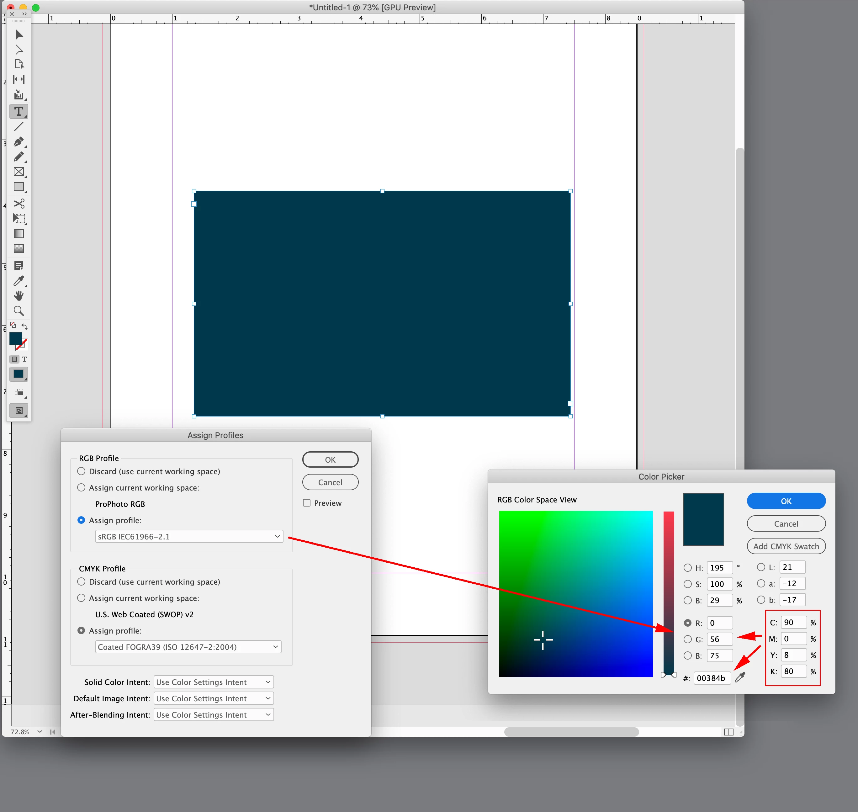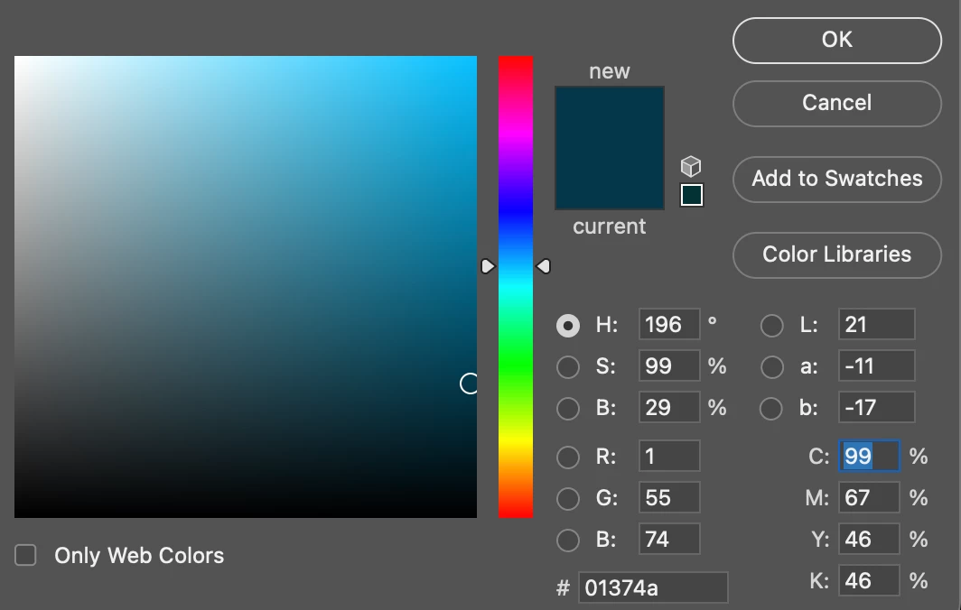 Below you can see that the online convertion from RGB to CMYK made it dark blue (96, 0, 8, 80) while the bar below is the CMYK color that Adobe suggest in the color panel (92, 50, 65, 67).