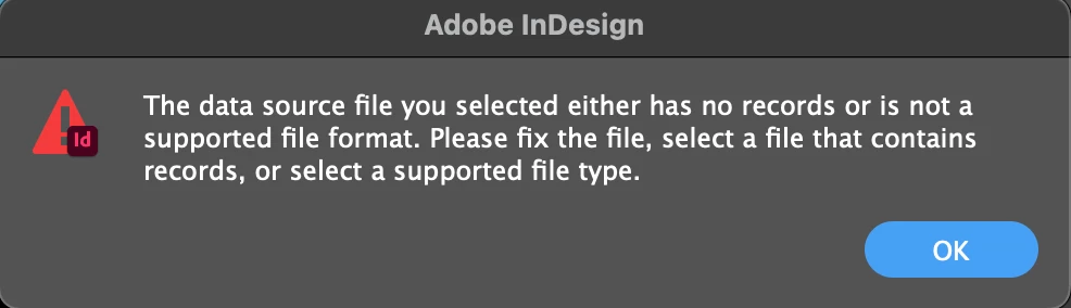 TextEdit recognizes the data, but even after resaving it from there without changes, InDesign still gives me the same error.