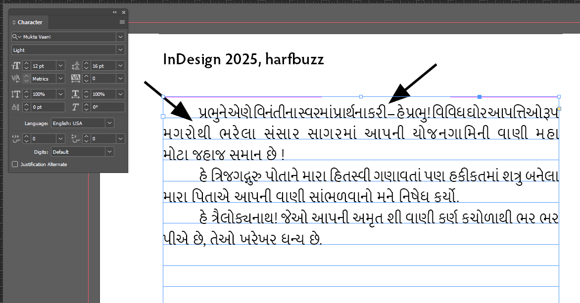 Thanks for the example; it's not a language I've worked in recently. I find it odd that the Mukta Vaani font you're using only works when it's not marked with the appropriate language. I tried a variety of other Gujarati fonts, and none of them behaved in this way. The fonts that rendered differently under different text shaping engines dropped the combining mark when the Legacy Text Shaping engine was turned on. So Mukta Vaani is the outlier, here. How important is it to you to use this font in particular? Can you reproduce the same issue with a different font? Can you reproduce this issue in another application that uses the same Harfbuzz text shaping engine? (I can't, for what it's worth; so long as I don't mark the text as Gujarati, this font seems to work fine in Scribus.)