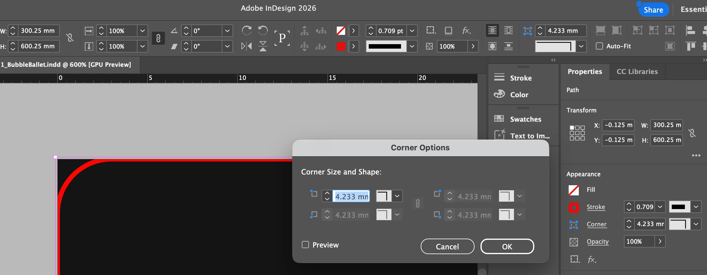 I’ve attached screenshots that show the dimensions and corner radius in both Illustrator and Indesign. One screenshot shows two dielines that are overlayed—I wanted to see if the corner radius actually was changing when bringing it from Illustrator to Indesign. The green dieline is one that I created myself in InDesign (300 mm x 600 mm, 3 mm corner radius). The red dieline is from the .dxf file with the 4.233 mm radius (it’s 3 mm in Illustrator, though). You can see the size difference most clearly in that screenshot.