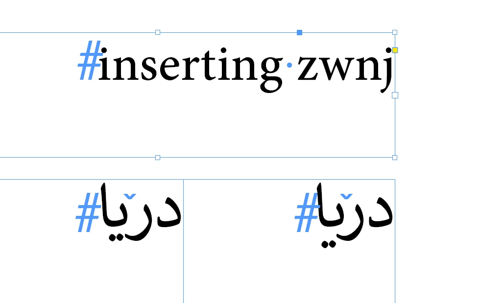 I found a bug in Arabic indesign. when you type "zer with none joiner" between to chracters If there is a kerning between these characters in old text shaping indesign ignors kerning but in new text shaping It ignors zwnj character and implements kerning so what happend? when you open idml of old files tou may see some changes in your layout and in long documnets It would be disaster.