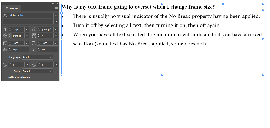 I feel like I'm losing my mind. I've tried everything to fix this text from disappearing when I adjust the box. Ignore text wrap is on. It's not aligned to the baseline grid. It's on a completely blank spread. It does this even when the bullet points aren't there. I've also updated the application, running on v20.4. Anything I look up, it just gives me the same options. Someone please help