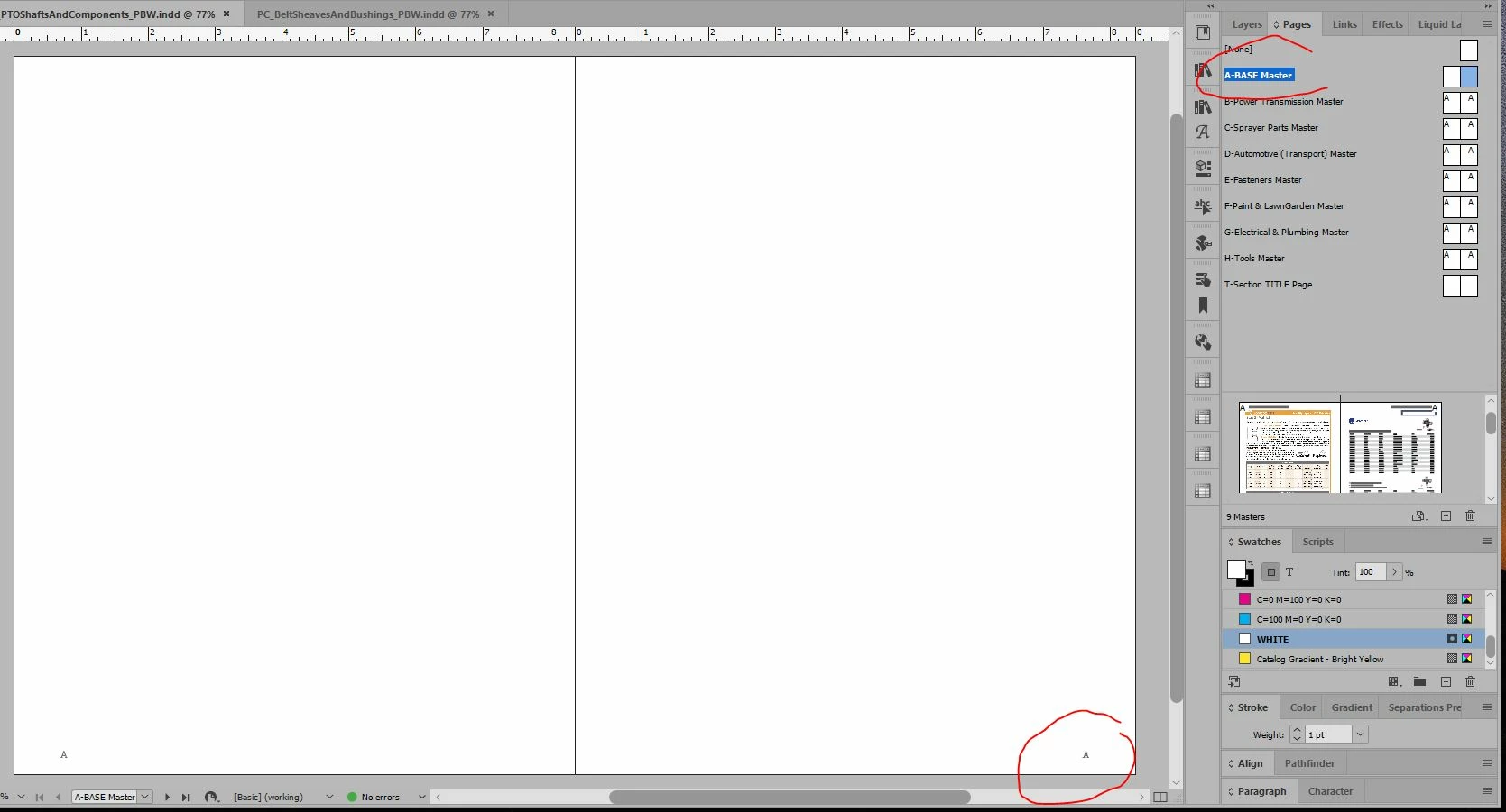 So, I have a facing pages, 2pg master "A-BASE Master" with pg # placeholder... see below screen capture.