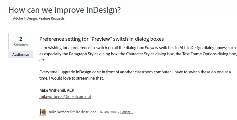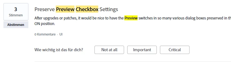 After Updating InDesign to 20.3.1 every window with a previous checked "preview"-checkbox gets reverted to unchecked – Every. Effin. Update.