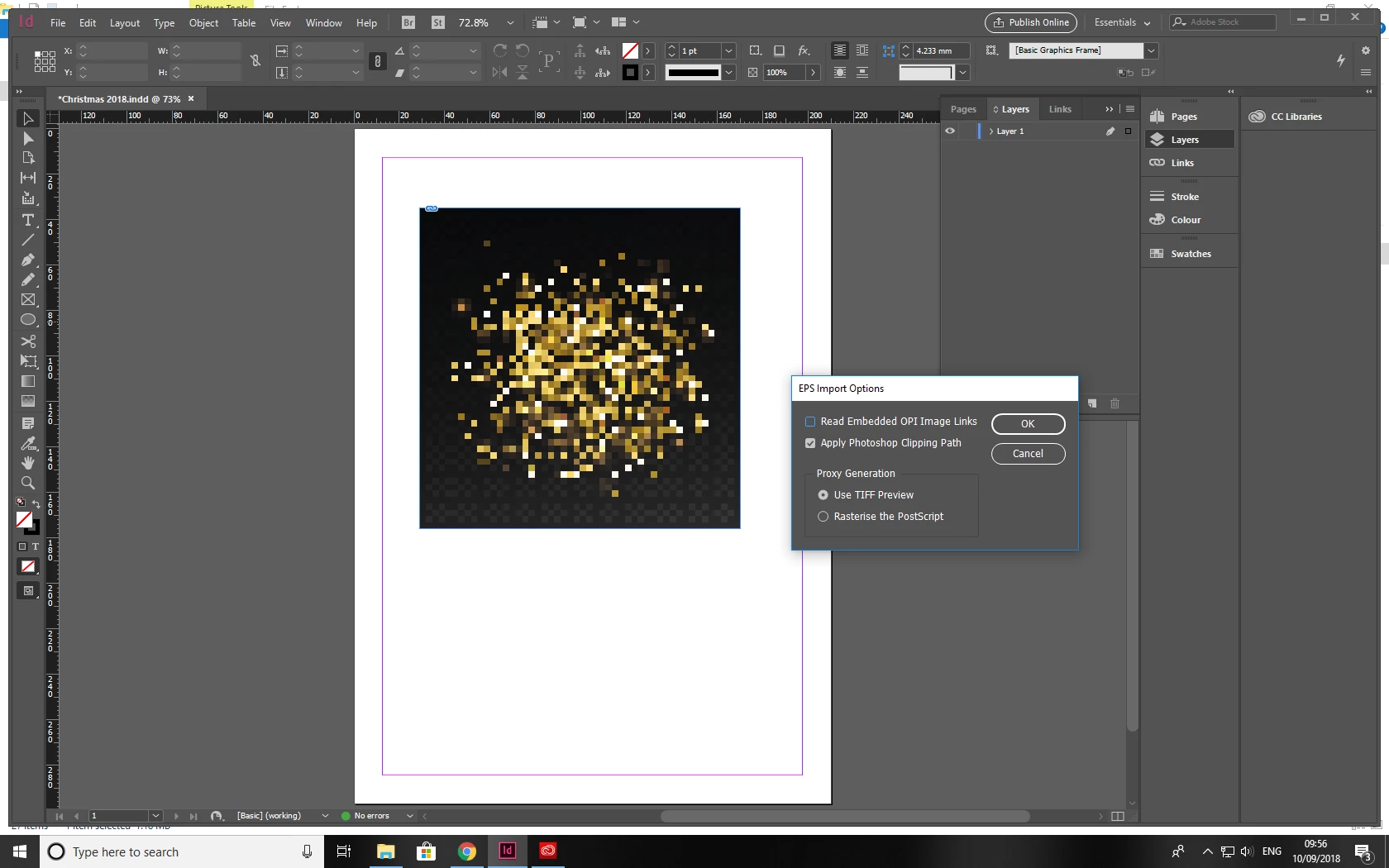 Below the EPS opened, saved as AI file, layers added and reordered with Illustrator and finally placed two times against a linear gradient fill in InDesign. Left all layers showing, right only top elements showing, background with black gradient and checkered elements not showing: