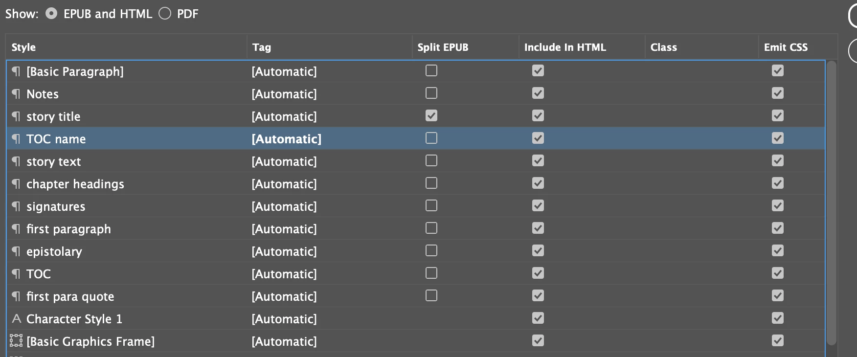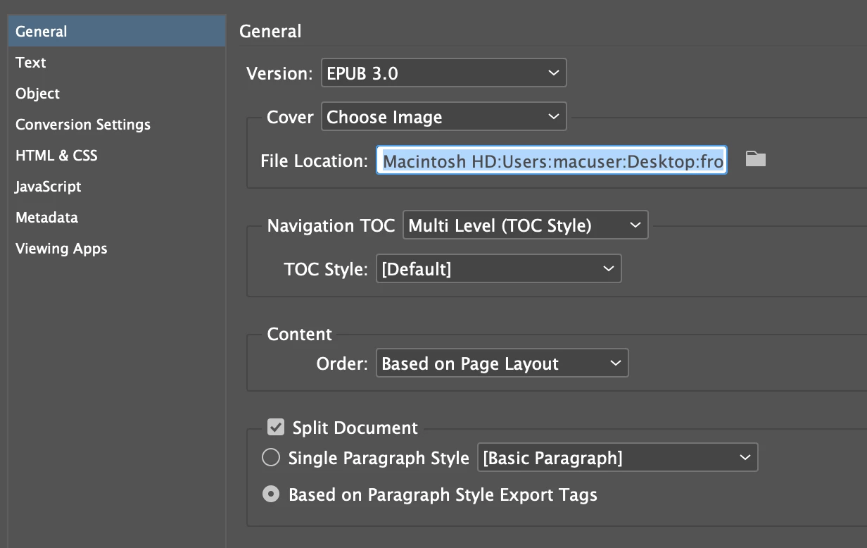 I set the export tag to split the epub on one particular paragraph style.