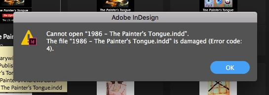 This new Indesign is painfully slow - it crashes and jams regularly  - and now tonight after closing down - what I believed was properly last night - I get this Error Code 4 message - This is an entire book - I am not only worried - I am deeply upset.
