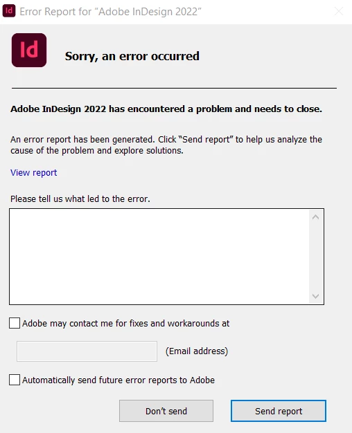 I keep having this message pop up when using InDesign. Sometimes even my whole laptop will freeze and shut down afterwards. Not sure how to solve this repeated message/shut down.