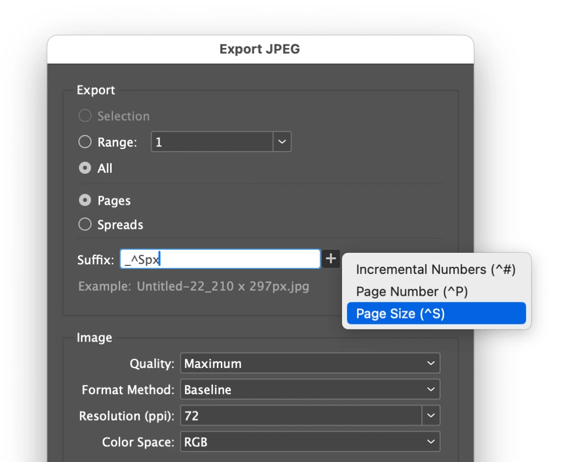 I have an existing script that exports jpegs. I am wondering if it is possible to add some lines to it so that it exports with the suffix 'Page size' and then 'px'. Any help with this would be greatly appreciated, thanks.