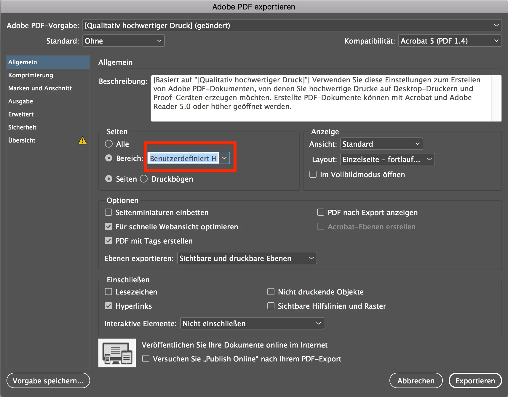 Mit Indesign CC 2018 (war schon 2017) kann ich im PDF-Druckmenü in InDesign nicht einen (Seiten) Bereich auswählen. Z. B. 1-2. Das zur Verfügung stehende PopUp zeigt nur den Inhalt "Benutzerdefiniert H" an, was so gar nix mit der erwarteten und früher bekannten Funktion zur Auswahl der gewünscht zu druckenden Seiten zu tun hat.