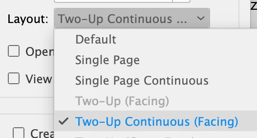 The default view of web browsers seem to be single page, but my project has spreads, and supposed to be viewed as Two Up facing with cover page. 😞