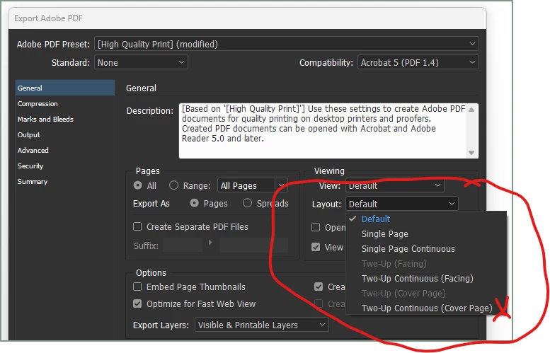 I want to export my zine and view it as a 2-page PDF, but with the cover appearing on its own, as it does in InDesign. The 1st screen shot below shows this. The 2d screen shot shows the PDF in 2-page view, with page 2 facing the cover. This throws the pairing of images in facing pages off. I want the convenience of someone looking at the PDF online but with the proper layout. How can I achieve this? Thanks.