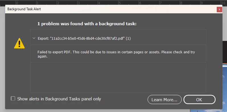 "Failed to Export PDF. This could be due to issues in certain pages or assets. Please check and try again."