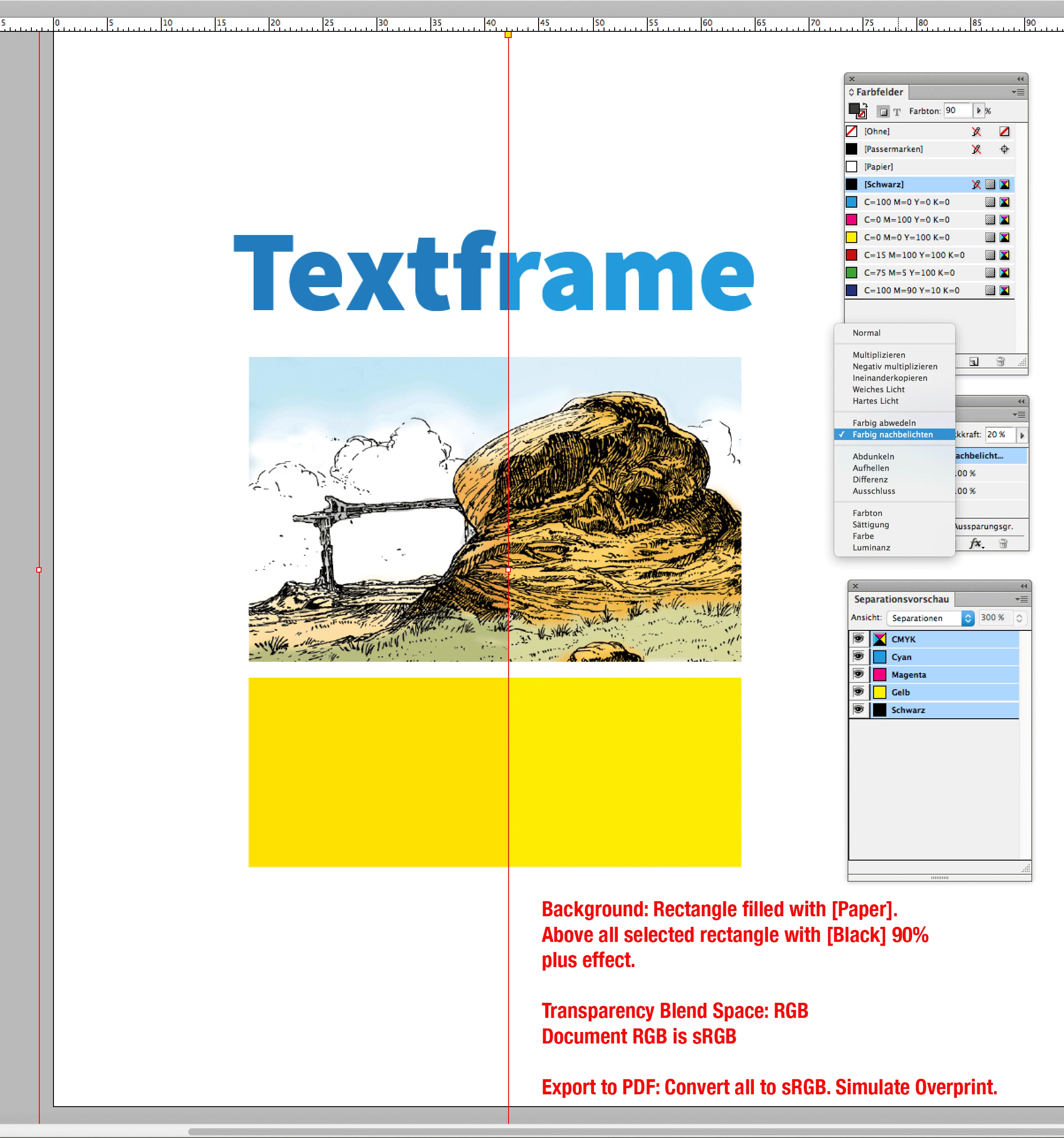 Basically you need a rectangle in the background of all page elements filled with [Paper] and a rectangle above all elements filled with 90% [Black]. The rectangle stacked above all elements has an effect applied with 20%, "Farbig nachbelichten" in my German InDesign. You can play a little with this value to change the darken effect. You also could change the fill of the rectangle to e.g. 85% [Black]: