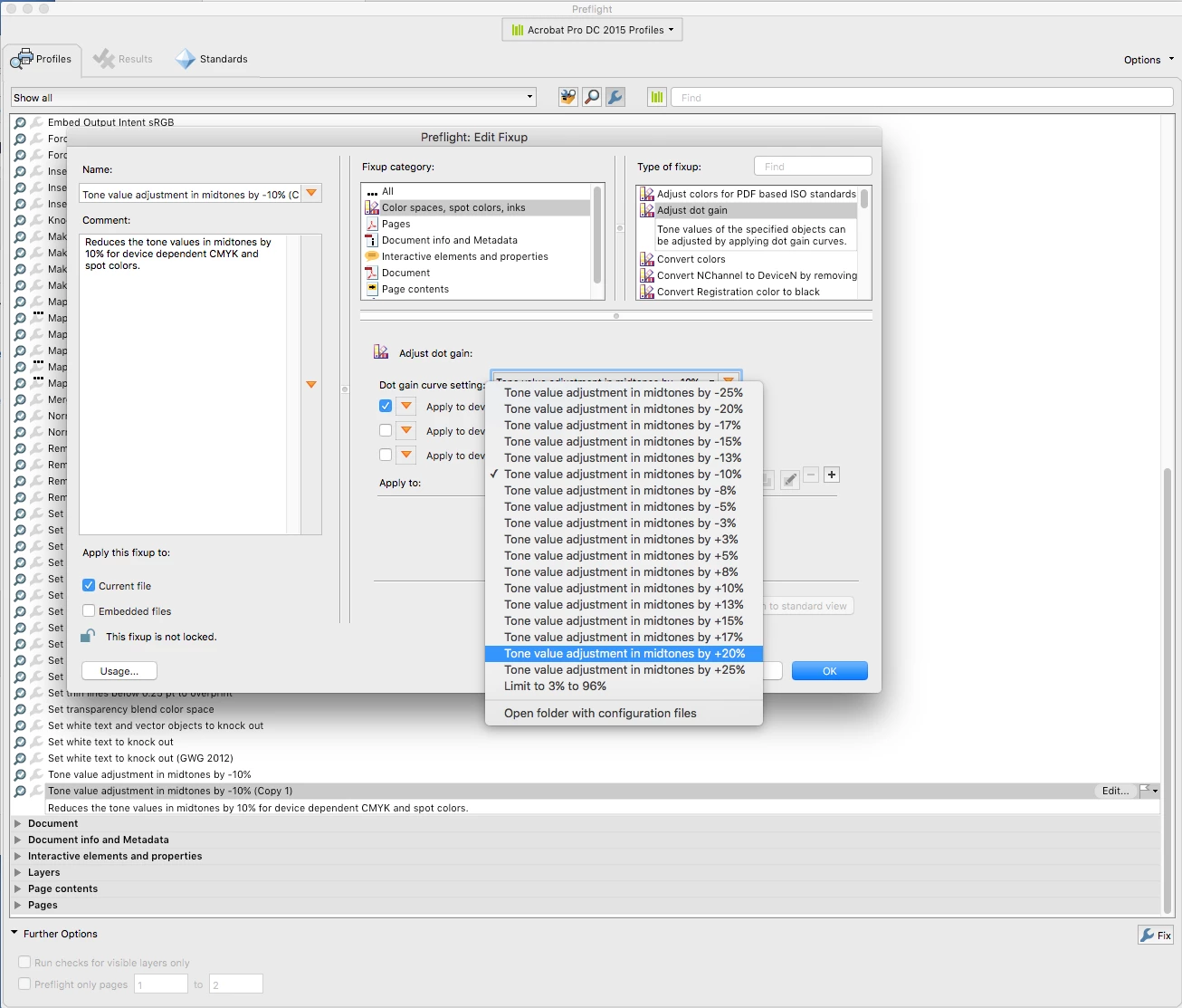 In Acrobat Pro, go to Tools> Print Production> Preflight> Fixups (blue wrench icon)> Convert colors, you will first need to go to the fly-out menu and duplicate the fixup "Tone value adjustment in midtones -10%" (you cannot edit the standard preflight, but you can edit a copy of it). In the new preflight, you will have more options to adjust the curve settings.