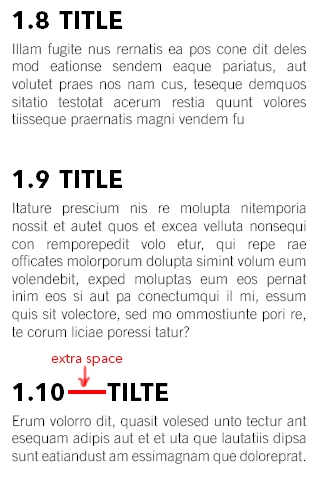 I have a problem with a paragraph style that I have created in InDesign. The style I’ve created is a numbered level 2 paragraph, it works fine for numbers from 1.1, 1.2…,1.9 but as soon as the numbers becomes double digit (like 1.10) an extra space/tab is added. In the picture below you can see the problem. Does anyone know why this is happening and how to solve it?